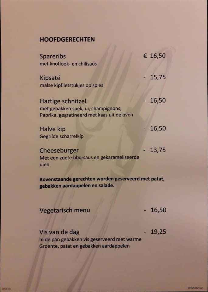 Spareribs menu: Kipsaté menu: Halve kip menu:Vis menu: (De vis kan dagelijks verschillen)
